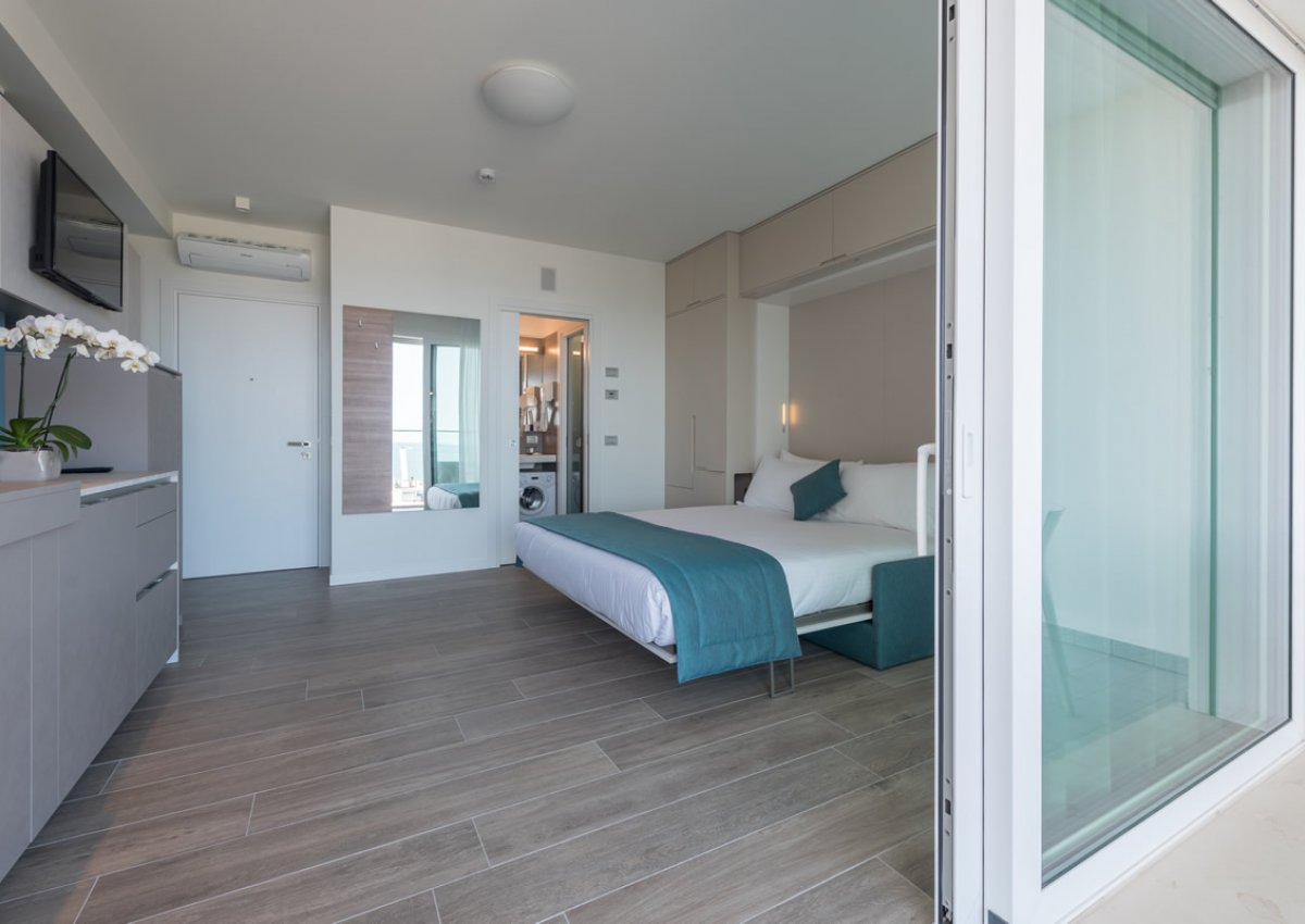Стильный и современный интерьер, нежный цвет стен гармонирует с полом из твердой древесинымягкие подушки удобные кровати и окна с звукоизоляцией обеспечат вам покой и отдых. Терраса на 10 кв.м. с потрясающим панорамным видом на море и на лагуну Венеции.